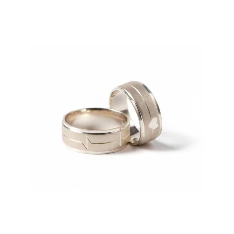 Detalhe: coração vazado na aliança feminina.